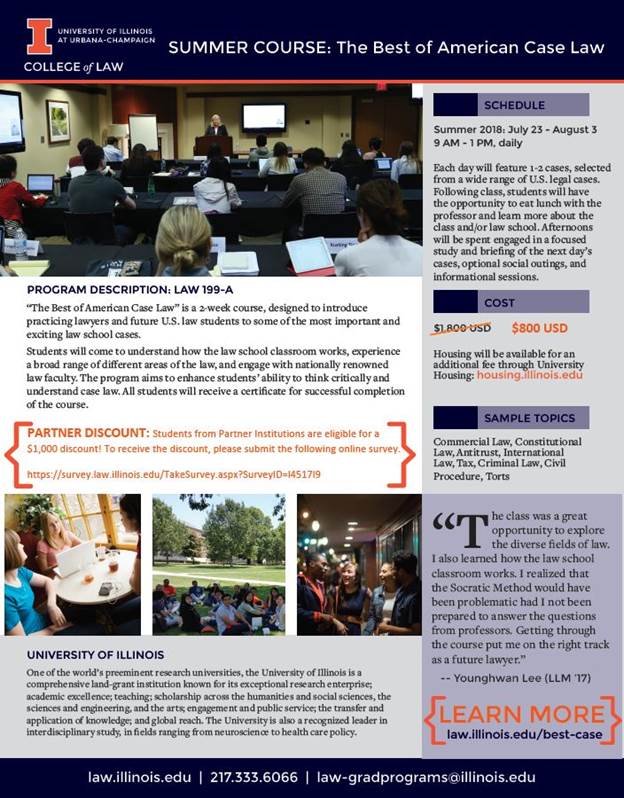 We are happy to announce that this year we are offering a discount of $1,000 for partner institutions and students on our summer program, The Best of American Case Law! This 55% discount makes the two-week program only $800. There is no nomination required. Simply have the student fill out this survey (https://survey.law.illinois.edu/TakeSurvey.aspx?SurveyID=l4517l9#) and we will be in contact with a discount registration link. For more information on this exciting summer program, please visit our website: https://law.illinois.edu/academics/courses/the-best-of-american-case-law/.