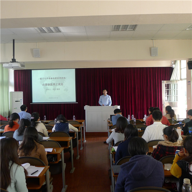 肖老师在沙龙开始后,对注册制改革的背景和焦点问题作了简要介绍。股票发行注册制改革自十八届三中全会《决定》提出以来,成为完善金融市场体系的一个热点,引发了证券市场上热烈的讨论,主要围绕着注册制之下股票发行审不审、审什么、谁来审、如何审等问题。针对这些问题,学者们观点各异。今年11月底,证监会已将注册制改革方案上报国务院,明年将公开向社会征求意见,本次沙龙正当其时,参与者可以充分阐述自己对注册制改革的观点。