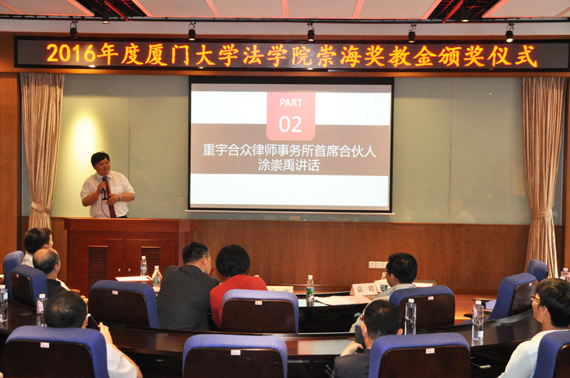 重宇合众律师事务所首席合伙人涂崇禹发表讲话,他对与会领导的莅临表示感谢,对六位获奖教师表示祝贺。涂崇禹简要回顾了崇海奖教金的设立过程,表示奖教金的设立对律所来说是一种精神激励,律所以及厦门的法律实务工作者愿意为法学院的教育事业做一些力所能及的工作,希望能与华人策略综合讨论一同推动厦门法律实务界与学术界的深入交流。