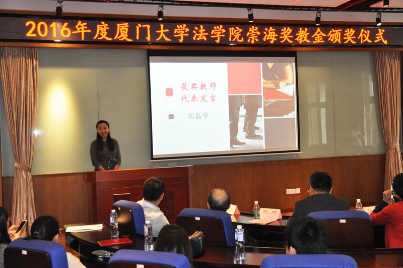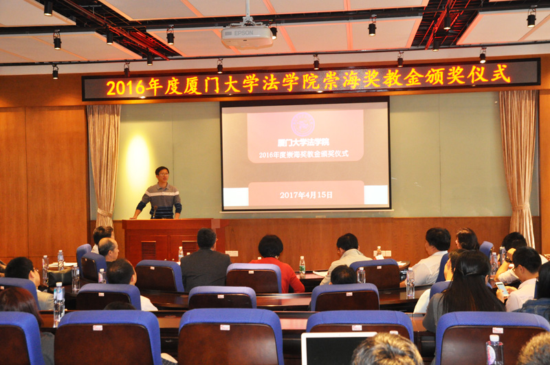 法学院团委书记高斌在仪式宣布了法学院崇海奖教金获奖名单。张膑心、刘学敏老师获得了教学类奖项;郑晓剑、郭春镇老师获得科研类奖项:刘巧英、宋磊华老师获党政管理类奖项。