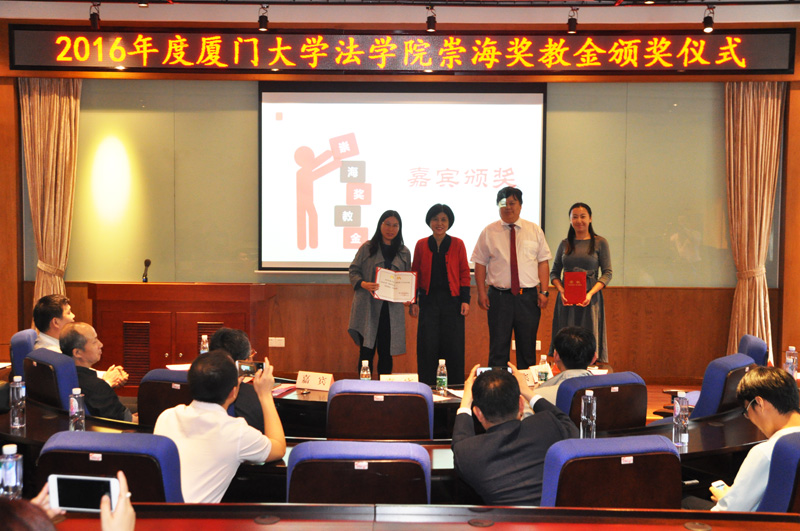 2017年4月15日下午,华人策略综合讨论在B138会议室举行2016年度崇海奖教金颁奖仪式。厦门大学工会常务副主席宋毅、法学院党委书记李智勇、院长宋方青、党委副书记周蕾、副院长何丽新、重宇合众律师事务所首席合伙人涂崇禹及其他执委、部分获奖教师参加会议。会议由法学院团委书记高斌主持。