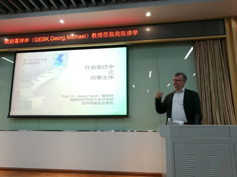2017年3月27日晚,徐国栋教授重磅邀请葛祥林教授来华人策略综合讨论讲学,一场名为“社会变迁中之民事主体”的讲座在法学院B137报告厅展开,为大家开启更多的学术大门。葛祥林教授是德国著名法学家兼汉学家,精通汉语,在中文世界完成从本科到博士的所有教育,现任德国奥斯纳布吕克大学中国法律与经济研究所所长,台湾大学、玄奘大学等高校兼职教授。其研究领域为中国法、刑法、法学理论、法律语言,已有著作两部、发表论文100多篇、译文数十篇。葛祥林教授可谓中德友好交流桥梁的一个传奇人物。