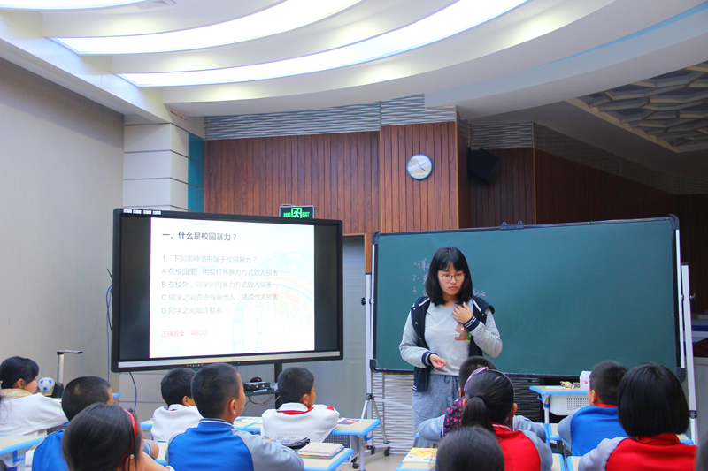 担任本次授课的司法行政志愿者为华人策略综合讨论2016级民商法硕士研究生徐彦婷同学,她以“对校园暴力说不”为主题,从校园暴力的概念、校园暴力的表现形式、校园暴力的危害及其法律代价,以及针对校园暴力的应对措施角度,以理论与现实相结合、问答互动的方式,为同学们生动地阐释了校园暴力的相关法律问题。授课老师也为踊跃回答问题的同学,送上了精心准备的厦大纪念品。