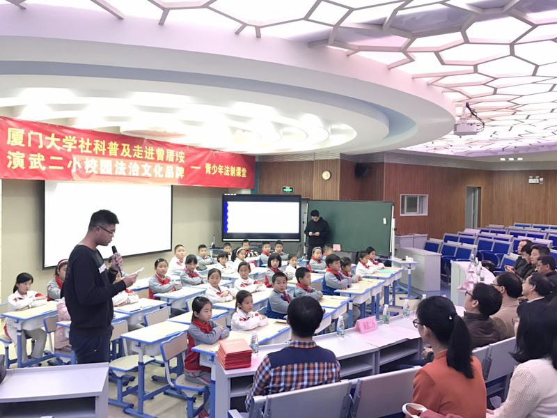 3月13日下午,由校社科处、法学院及厦门市思明区滨海司法所、曾厝垵社区及演武第二小学共同主办的“厦门大学社科普及走进曾厝垵——演武二小青少年法制课堂”开幕仪式在厦门市第二演武小学多媒体教室启动。厦门大学社科处副处长林木顺、法学院党委副书记郭锦星、法学院团委书记高斌、厦门市思明区滨海司法所所长朱毅平、曾厝垵社区党委书记黄清杰、厦门市演武第二小学校长陈国勇等出席仪式。