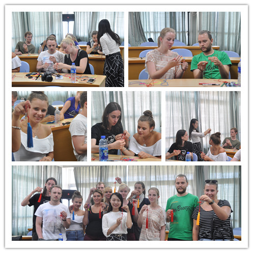 9月22日上午,来自特里尔大学的同学们学习了编制中国结。老师以介绍中国结历史的方式开场:中国结始于远古时代的缝衣打结,人们打结的目的在于起到记事的功能。后来人们在打结中不断增加一些美学价值,将中国结系于印纽、铜镜还有佩玉上,起到装饰之用。老师随后介绍了不同种类的中国结代表的不同含义,例如:团圆结象征着团圆美满,平安结象征着岁岁平安,盘长结象征着永恒不灭,福字结象征着福气满堂,双蝶结象征着比翼双飞。